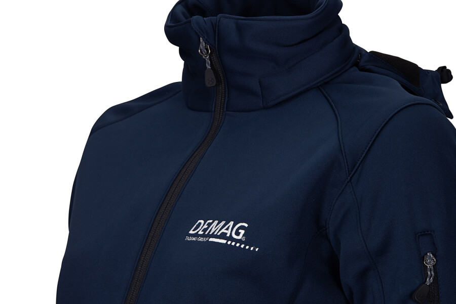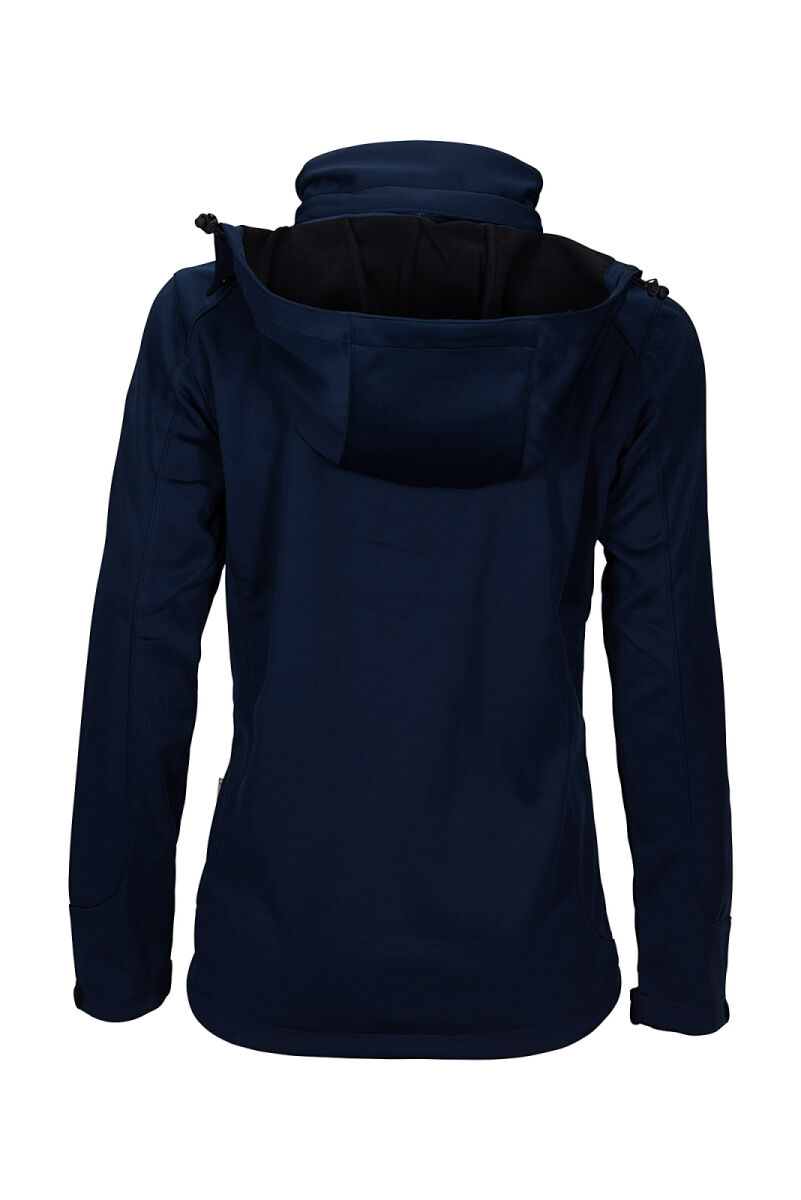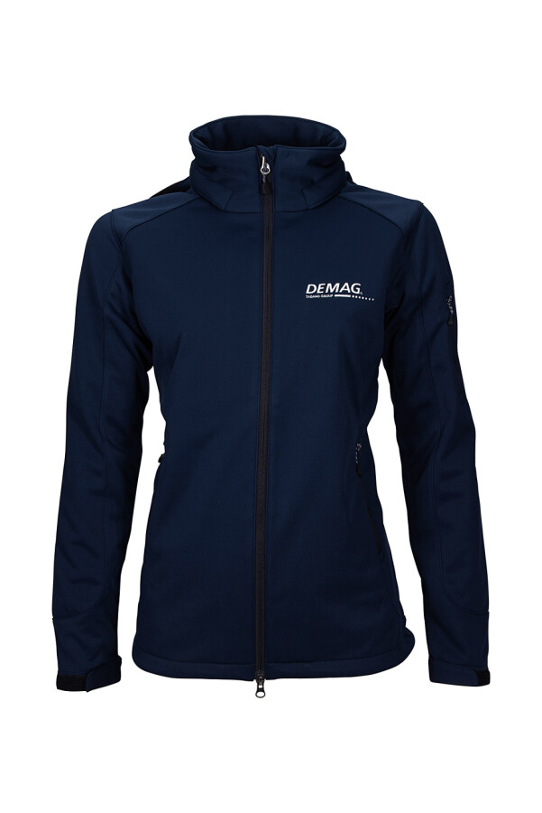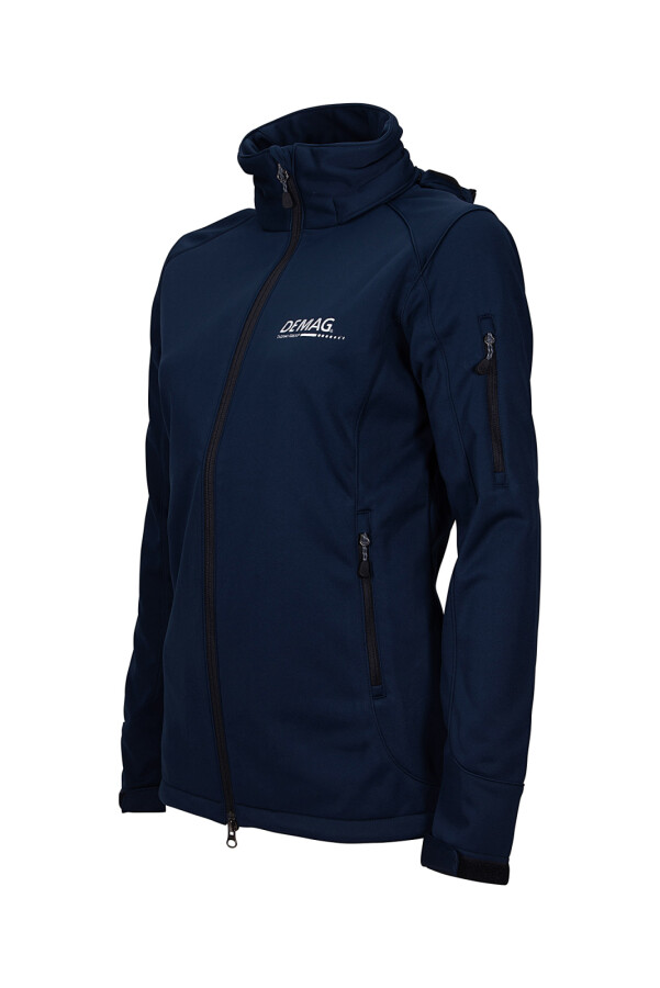 Women's dark blue warming, breathable, durable, waterproof and windproof softshell jacket. The regular-fit jacket has a detachable hood, a two-way front zip fastener with inner wind protection and chin guard, a zip pocket on the left sleeve and side zip pockets. The interior of the jacket is made of light microfleece and the jacket has Velcro straps at the sleeve ends for stepless adjustment.