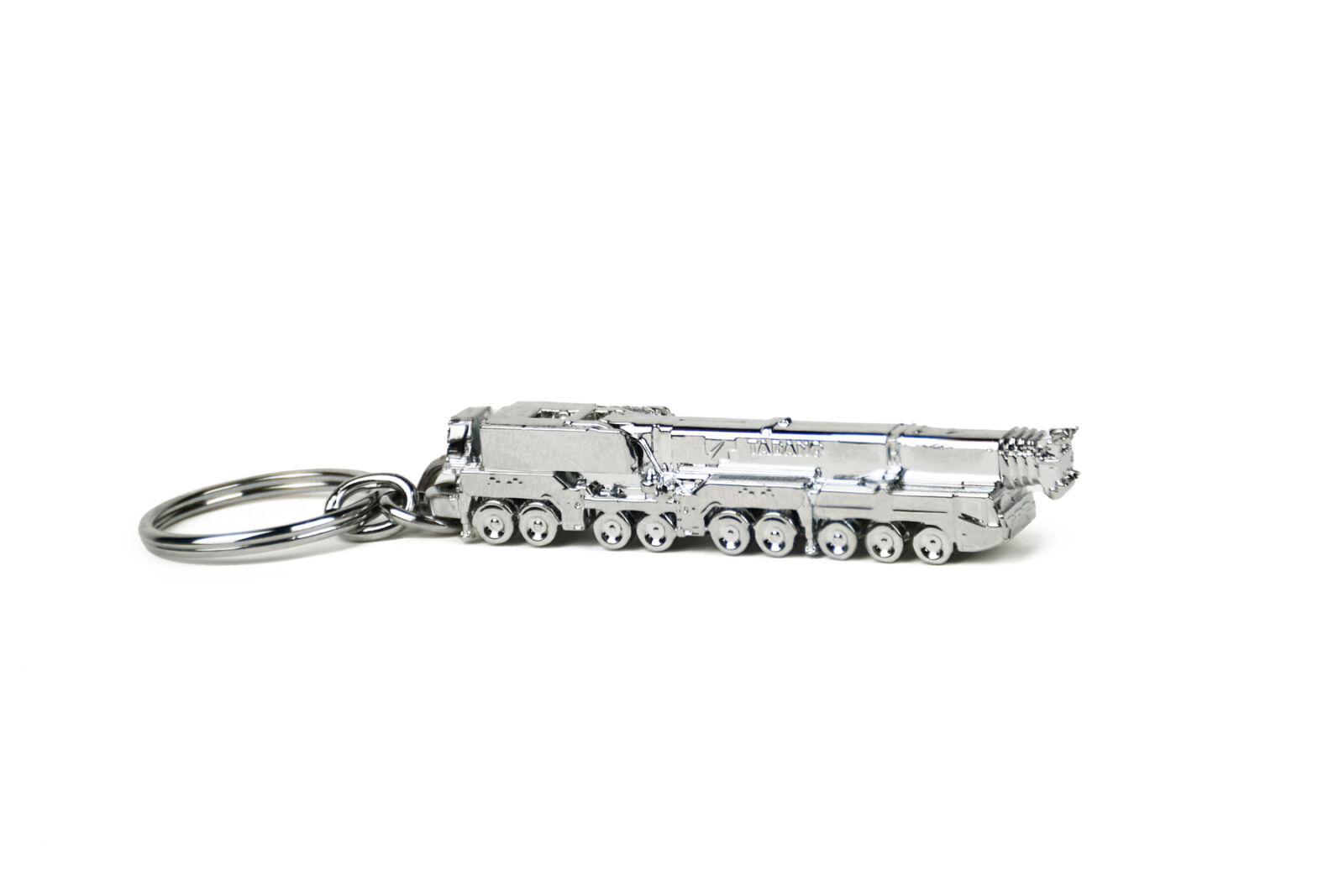 : Metal keychain of our AC 9.700-1 all-terrain crane, made from aluminum for wear-resistance.